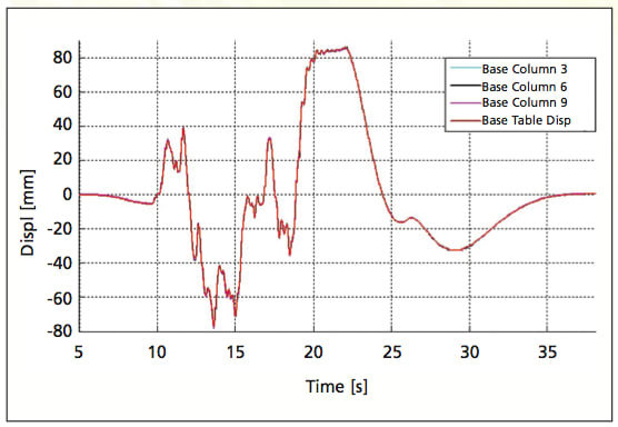 In order to test the accuracy of this innovative optical measurement system, EUCENTRE compared the movement results for the bases of the building’s support columns against the known movement of the shake table to which they were attached. Under low acceleration conditions, the column bases should undergo simple rigid translation, so that their movements should correspond to the table’s movement. As shown in Figure 4, the results were a nearly perfect match.