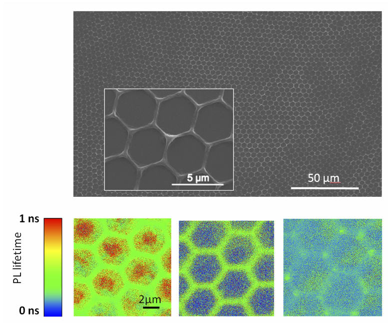 The scientists verified the uniformity of the honeycomb structure with various scanning probe and electron microscopy techniques, and tested the optical properties and charge generation at various parts of the honeycomb structure (edges, centers, and nodes where individual cells connect) using time-resolved confocal fluorescence microscopy.