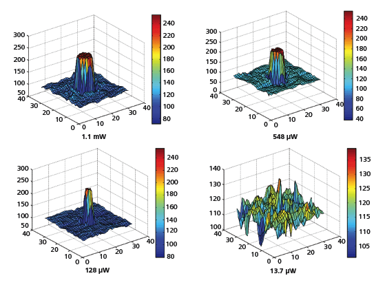 A new optical beam tracking approach for free-space optical communication links using two-photon absorption (TPA) in a high-bandgap detector material was demonstrated. This tracking scheme is part of the canonical architecture described in the preceding article. TPA is used to track a long-wavelength transmit laser while direct absorption on the same sensor simultaneously tracks a shorter-wavelength beacon. The TPA responsivity was measured for silicon using a PIN photodiode at a laser beacon wavelength of 1,550 nm. As expected, the responsivity shows a linear dependence with incident power level. The responsivity slope is 4.5 × 10–7 A/W2. Also, optical beam spots from the 1,550-nm laser beacon were characterized on commercial charge-coupled device (CCD) and complementary metal-oxide semiconductor (CMOS) imagers with as little as 13.7 μW of optical power (see figure). This new tracker technology offers an innovative solution to reduce system complexity, improve transmit/receive isolation, improve optical efficiency, improve signal-to-noise ratio (SNR), and reduce cost for free-space optical communications transceivers.
