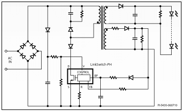 LinkSwitch-PH devices incorporate the PFC/CC controller, a 725 V MOSFET, and MOSFET driver into a single package, which simplifies layout and design and eliminates parasitic elements between the controller and MOSFET. The new ICs eliminate up to 25 additional components used in traditional isolated flyback designs, including the high-voltage electrolytic bulk capacitor and the optocoupler — the components most likely to limit the lifetime of an LED lamp.