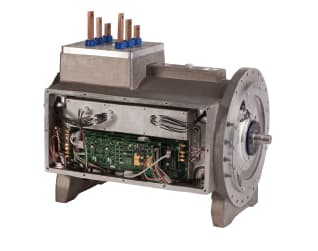 Integrated Magnetic Bearings. Figure 3 illustrates radial and thrust bearings with completely integrated control electronics. The rated load capacity for this radial bearing is 300 pounds, and the rating of the thrust bearing is 1,000 pounds. Despite the integration of the control electronics, the size of these bearings is less than past magnetic bearings that required an additional, large, external controller. Each bearing is powered by 48 VDC and includes a dedicated Ethernet port for high-speed communications and health monitoring. The small size and simplified mechanical and electrical interface make it easy to integrate the bearing into rotating machines such as motors, pumps, fans, and turbines.