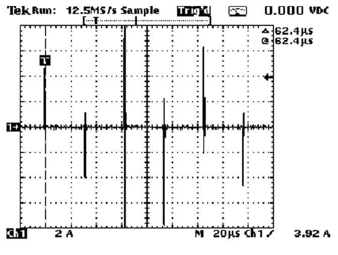 This noise occurs with the complex model of a motor or load of a servo amplifier or power supply. The inductance and capacitance not being equal in a three-phase motor can create stray currents that are common to all three phases and the ground. When this occurs, the current spikes can go unnoticed by standard measurement techniques. Figure 3 shows a plot from an oscilloscope and current probe across three leads of the motor. The spikes are occurring at the edge of each commutation of a 16-KHz PWM frequency. Because of the way this propagates, you can have paths that you didn’t account for or possibly cannot eliminate entirely.