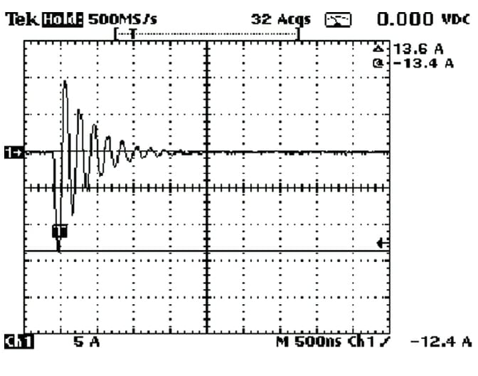 When clamped across the three phases of a drive with a current probe, you can have significantly ringing signals. In cases where equipment is completely laid out, you may be required to accept the limitations that you cannot be perfect, but improve within an acceptable level. The signal in Figure 3 is an unacceptable signal for this application. It is a common mode signal measured in an application where an 18-ampere drive had common mode issues. This was intermittently affecting digital signals in the system. The equipment was already completely designed and a total layout change was not possible. The noise was measured at 13.6 amperes peak. Improvements were made, and the following improvement gave a large margin of immunity for the digital errors that were seen previously. Using a combination of proper shielding and a common mode choke, the signal ringing was eliminated. Good layout, good grounding, and proper shielding are more easily employed with upfront design.