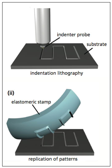 These characteristics produce patterns with three-dimensional relief, which would be impossible to achieve using lithographic techniques in which features have a fixed depth and approximately vertical sidewalls. Resultant patterns can then be replicated as shown in Figure 1 to produce a stamp bearing an inverse replica of the original pattern. Such replicas can in turn be used to pattern other materials in an efficient and cost-effective manner.