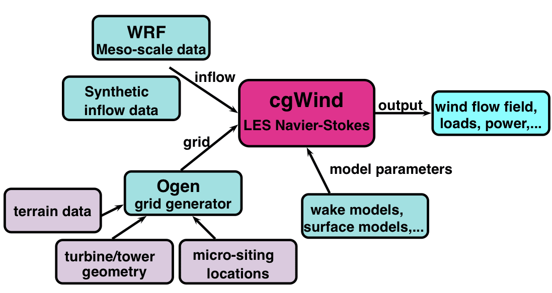 CgWind will also interface to the Weather Research and Forecasting (WRF) meso-scale model to simulate wind-farm scale problems for siting studies and wind park performance analysis. In particular, WRF can provide time varying inflow conditions to CgWind, thereby incorporating the local weather conditions. Terrain data can be imported from GIS sources, meshed, and incorporated into the model. For large-scale park models, CgWind provides an interface for wake models thereby obviating the need to highly resolve hundreds of turbines.