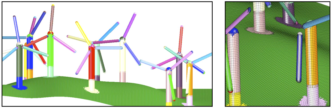 CgWind’s technology exploits the composite grid approach, which leverages the computational benefits of overlapping, structured grids to represent complex geometry. These grids are ideal for the high-order accurate compact discretizations used by CgWind as well as the matrix-free geometric multi-grid algorithm that enables large-scale, high-resolution computations with realistic geometry. The composite grid approach, also known as overlapping or Chimera grids, provides a natural and efficient mechanism for modeling bodies in relative motion. Each turbine blade and tower is meshed independently with high-quality, structured grids and assembled automatically into a collection of overlapping grids. When the geometry moves (e.g., the blades rotate or deform), the new configuration undergoes local regridding, which is orders of magnitude faster than the global remeshing methods used in many unstructured mesh approaches.
