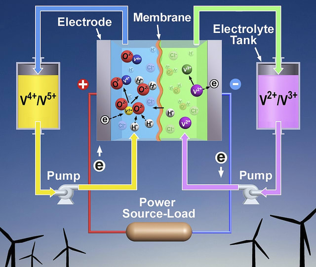Renewable power production depends on uncontrollable natural phenomena such as sunshine and wind, and storing electricity can help smooth out the intermittency of renewable power while also improving the reliability of the electric grid that transmits it. Vanadium batteries can hold on to renewable power until people turn on their lights and run their dishwashers. Other benefits of vanadium batteries include high efficiency and the ability to quickly generate power when it's needed, as well as sit idle for long periods of time without losing storage capacity.