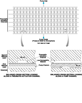 The pneumatic-actuation channels would be alternately connected to a compressed gas and (depending on pump design) either to atmospheric pressure or to a partial vacuum source. The design would be such that the higher pneumatic pressure would be sufficient to push the silicone arches down onto the substrates, blocking the channels. Thus, by connecting pneumatic-actuation channels to the two pneumatic sources in spatial and temporal alternation, waves of opening and closing, equivalent to peristalsis, could be made to move along the pump channels.