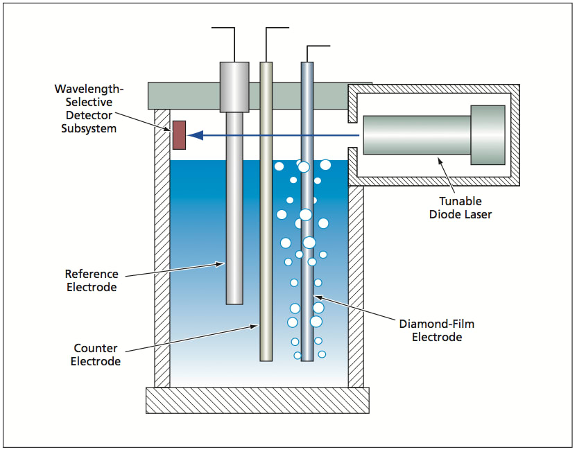 This new TOC instrument (see figure) includes a BDD electrode, a counter electrode, and a reference electrode in a cell containing an aqueous solution to be tested. A positive potential of about 2.5 V versus the reference electrode is applied to the BDD electrode to cause the organic material in the solution to become oxidized, thereby producing H2O and CO2. A headspace above the solution traps escaping CO2. The concentration of the CO2 can be measured by a miniature infrared absorption spectrometer comprised of a tunable diode laser and an associated wavelength-selective detector subsystem. The TOC of the solution is proportional to the concentration of CO2 in the headspace.