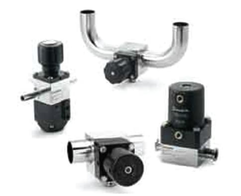 The valve is made of Type 316L stainless steel with modified PTFE wetted single-piece diaphragms. It is available with sanitary clamp or butt weld end connections. The valves are designed for system pressures up to 150 psig and operating temperatures to 280°F. Five sizes from ½ to 2 in. are available with a choice of pneumatic or manual actuators in plastic or aluminum.