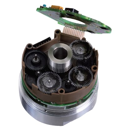 To track shaft position, the multi-turn encoder utilizes a trio of plastic gears driven off of the main shaft or hub. These gears utilize special coatings that allow light to either be absorbed or reflected back, activating several critically positioned photo sensors. The on/off patterns of these sensors define the multi-turn position. One sensor is required per bit of information, so a 17- bit-per-turn encoder will require 17 photo receivers to carry out the job.