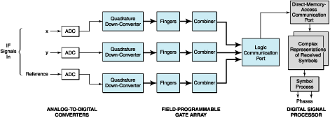 In the receiver (see Figure 2), the intermediate-frequency (IF) signals from the three antenna elements would be digitized, then processed through quadrature down-converters, then processed through fingers (defined in the next sentence) and combiners, the use of which would simplify the hardware needed to track the multipath components. As used here, "finger" signifies a time-multiplexed functional block that enables (at the expense of memory) the use of the same circuitry to track the signals arriving on multiple paths. Each finger would manage its own spreading-sequence timing and would perform its own multipath acquisition and tracking, despreading, and maximum-likelihood detection of orthogonal symbols. The combiners would provide the appropriate delays to align the symbols from the fingers for addition.