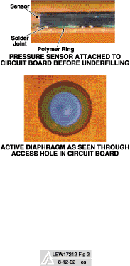 With the sensor resting on the polymer rings, the chip can be underfilled without the risk of contaminating the diaphragms. The active diaphragm is shown in the lower part of Figure 2, as seen through the access hole in the circuit board after the chip was attached and underfilled. The technique described provides a means for securely attaching and underfilling a MEMS-based pressure sensor to a circuit board while allowing the diaphragm access to the ambient fluid.