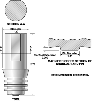 The tool for friction stir tack welding (see figure) resembles the tool for full friction stir welding, but has a narrower shoulder and a shorter pin. The shorter pin generates a smaller workpiece-separating force so that clamping suffices to keep the workpieces together. This tool produces a continuous or intermittent partial-penetration tack weld. The tack weld is subsequently consumed by action of the larger tool used in full friction stir welding tool.