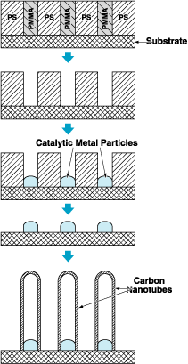 In a typical application (see figure), one would begin by coating a substrate with a film of PS/PMMA diblock copolymer. (A typical substrate material would be silicon with a surface layer of silicon oxide.) The block copolymer film would be treated to form the desired repeating nanostructure. The nanostructured block copolymer would be exposed to ultraviolet light or to high-energy electrons, either of which would degrade the PMMA more than it would degrade the PS. The workpiece would be washed in acetic acid to remove the degraded PMMA, yielding a substrate covered with a thin film of polystyrene containing a regular array of nanometer-sized holes, into which catalytic metal could be deposited either electrochemically or from vapor. The polystyrene would be removed from around the deposited metal particles by oxidation, solvation, or etching with reactive ions. Remaining on the substrate would be a regular array of catalytic metal dots, on which a regular array of carbon nanotubes could then be grown.
