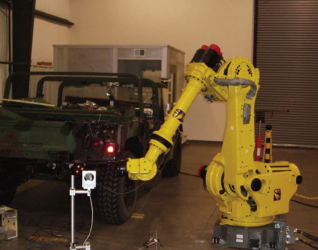 The colors of a soldier’s uniform are chosen according to the theatre of deployment, and the same rule applies for a vehicle’s paint. The U. S. Marine Corps Depot Operations are responsible for the three R’s of military vehicles: repair, refurbish, rebuild. Because the depots operate as a large scale garage and not a mass manufacturer, the vehicles are refurbished according to the military’s current needs. For example, a jeep that was in service in a tropical region may get a paint job that is appropriate for desert operations. But the depots are under considerable pressure to reduce costs and increase productivity, and re-painting a vehicle’s camouflage patterns is a manual and therefore labor-intensive, time-consuming task. Matt Collins, Vice-President of Vision Systems International (VSI) (Ann Arbor, MI) describes the painting of camouflage patterns on vehicles as a ‘bottleneck operation’. “The patterns are complex and are outlined in chalk by hand before the paint is applied, also by hand.”.