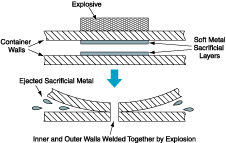 Figure 1 depicts the process stages. In its initial double-wall form, the volume between the walls is isolated from the environment; in other words, the outer wall (which is later sacrificed) initially serves to protect the inner container from contamination. The sample is placed inside the container through an opening at one end, then the container is placed into a transfer dock/lid. The surfaces that will be welded together under the explosive have been coated with a soft metallic sacrificial layer (see Figure 2). During the explosion, the sacrificial layer is ejected, and the container walls are welded together, creating a strong metallic seal. The inner container is released during the same event and enters the clean environment.