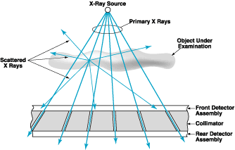 The collimator is made from a plate of an x-ray-absorbing material. Holes that are radial to the x-ray source are drilled or otherwise formed in the plate. These holes are wide enough to pass a detectable fraction of the primary (radially propagating) x rays and not so wide as to pass a substantial fraction of scattered (non-radially-propagating) x rays. Of course, the x rays are blocked from those rear detectors that are covered by the solid portions of the collimator; hence, the image detected by the rear detector assembly is a low-resolution image formed in primary x rays.