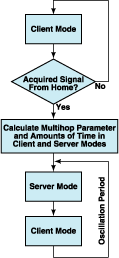 Each node oscillates between the client and server modes, dynamically adjusting the time allocated to each mode (see figure). In addition, each node allocates a fixed amount of time to its own local collection of sensory data. The probability of finding the node in one mode or the other depends on its geographical position relative to home. For this purpose, the distance from home is expressed as the multihop parameter of the node, defined as the ratio between (1) its geographical distance from home and (2) the radio-reception distance beyond which the probability of bit error exceeds a value defined in a controlled test scenario. A node located closer to home adapts toward statistically allocating more time as a server, while a sensor located farther from home adapts toward statistically allocating more time as a client. Prior to entering the oscillation, a node waits for home to broadcast (and for any intervening nodes to relay) a message stating the current location of home. Once it goes into the oscillation, the node also relays the home-location message to nodes farther from home.