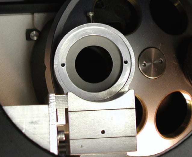 Mad City Labs based the C-Focus design on its popular Nano-F100 piezo electric stage and Nano-Drive(TM) 85. The system uses the Mercury encoder sensor mounted on a very low CTE Invar bracket fixed to the body of the microscope. Parallel to this is the encoder’s low CTE glass scale, which rides up and down on the aluminum housing to which the objective lens is mounted.