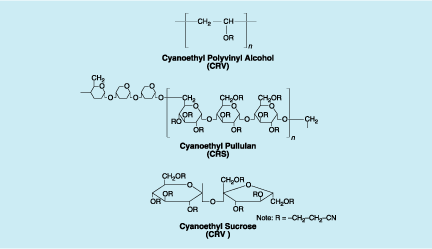 Three commercially available amorphous cyanoresins are under consideration as candidate polymeric electrolytes. These are cyanoethyl polyvinyl alcohol (CRV), cyanoethyl pullulan (CRS), and cyanoethyl sucrose (CRU)(see figure). CRV is a rubbery solid with a relatively low Tg of 30 °C. CRS, which has a Tg of 105 °C and a high molecular weight (760,000) has been studied for use in capacitors and can be processed to form excellent thin films. CRU is a viscous liquid at room temperature, with a molecular weight of 782. These cyanoresins are ideal candidates to be blended and complexed with appropriate Li salts to form polymeric electrolytes of various Tg's for use with composite electrodes and as cell separators with high ionic conductivities. Conventional candidate Li salts include LiClO4, LiPF4, and LiCF3SO3.