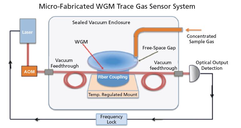 While a variety of techniques exist to monitor trace gases, methods relying on absorption of laser light are the most commonly used in terrestrial applications. Cavity-enhanced absorption techniques typically use high-reflectivity mirrors to form a resonant cavity, inside of which a sample gas can be analyzed. The effective absorption length is augmented by the cavity’s high quality factor, or Q, because the light reflects many times between the mirrors. The sensitivity of such mirrorbased sensors scales with size, generally making them somewhat bulky in volume. Also, specialized coatings for the high-reflectivity mirrors have limited bandwidth (typically just a few nanometers), and the delicate mirror surfaces can easily be degraded by dust or chemical films.