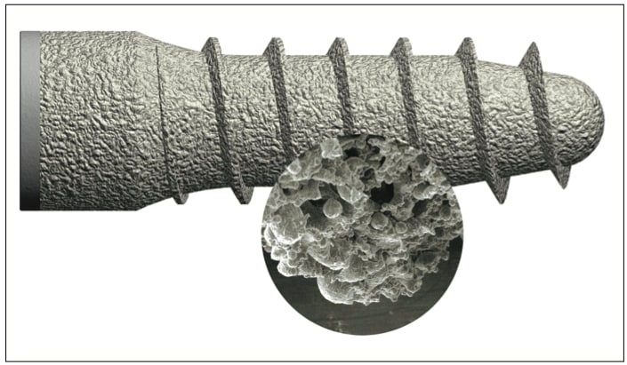 One supplier’s patented line of titanium dental implants includes a uniquely complex surface geometry that promotes bone growth. The dental implant surface is characterized by 2-200 micron cavities created during laser sintering (see Fig. 2). These porous surface characteristics cannot be readily obtained through traditional metal-finishing methods. Both the pores and the isoelasticity of the dental implant surface (a Young’s modulus nearly identical to that of bone) promote osseointegration and accelerated bone healing following surgery (see Fig. 3). The dental implants are manufactured using Ti64, a pre-alloyed Ti6AIV4 alloy powder that is much like its conventional counterpart.