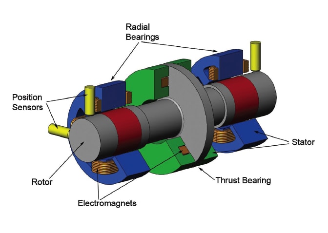 Each magnetic bearing consists of a rotor that rotates with the shaft and a stator that contains electromagnets and position sensors. An active magnetic bearing maintains clearance between the rotor and stator using a closed-loop feedback system that controls the shaft’s position. Sensors detect the local displacements, a digital processor interprets these signals, and power amplifiers provide currents to the electromagnets. The cycle of position sensing, processing, and amplification repeats an impressive 15,000 times per second.