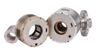 Integrated Magnetic Bearings. Figure 3 illustrates radial and thrust bearings with completely integrated control electronics. The rated load capacity for this radial bearing is 300 pounds, and the rating of the thrust bearing is 1,000 pounds. Despite the integration of the control electronics, the size of these bearings is less than past magnetic bearings that required an additional, large, external controller. Each bearing is powered by 48 VDC and includes a dedicated Ethernet port for high-speed communications and health monitoring. The small size and simplified mechanical and electrical interface make it easy to integrate the bearing into rotating machines such as motors, pumps, fans, and turbines.
